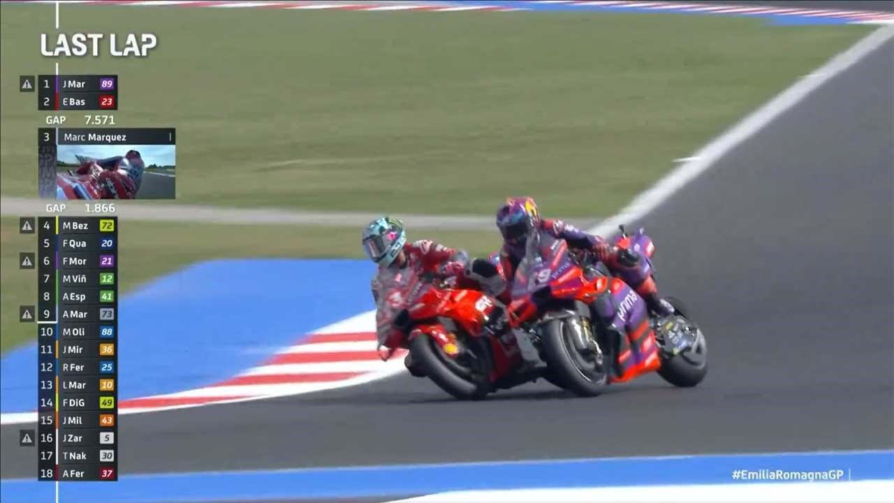 O final do Grande Prémio Emilia Romagna de MotoGP está a gerar polémica. Jorge Martín esteve a maior parte da corrida na liderança, mas na última volta foi ultrapassado por Bastianini com um 'toque'. Depois da ultrapassagem, o piloto espanhol queixou-se de que foi empurrado e acabou mesmo por mostrar um 'mangito' após passar a meta.