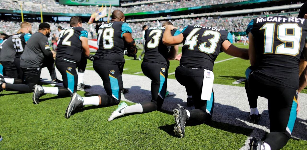 A iniciativa de ajoelhar ou sentar durante o hino partiu de Colin Kaepernick, então nos San Francisco 49ers e agora sem clube, e tem sido criticada pelo presidente dos Estados Unidos, Donald Trump, que pediu aos adeptos para deixarem de comparecer em jogos onde o protesto aconteça.