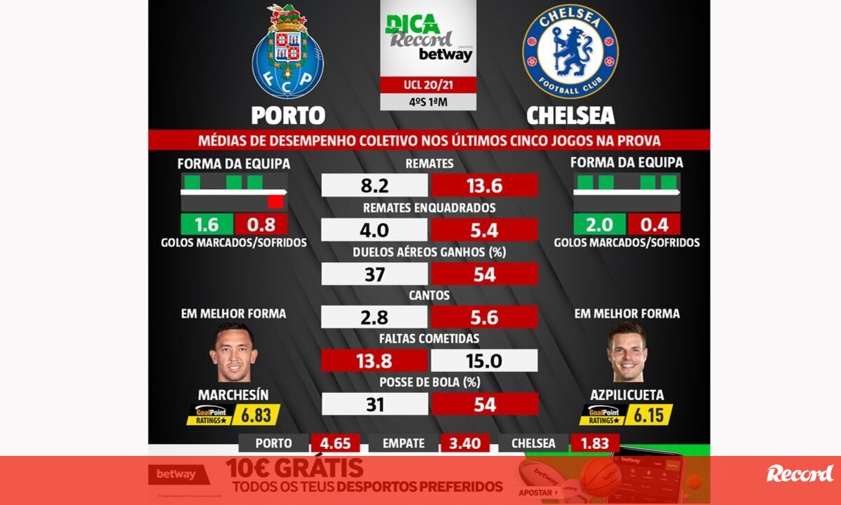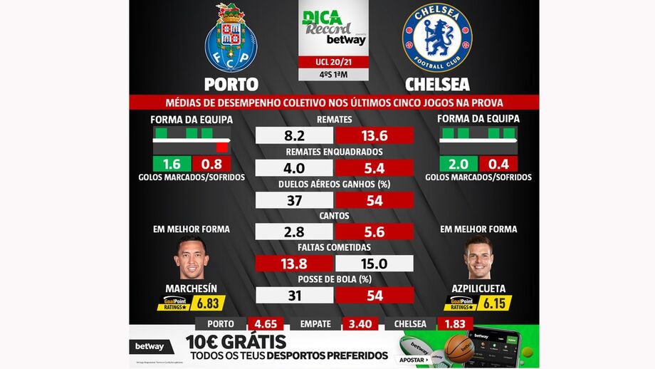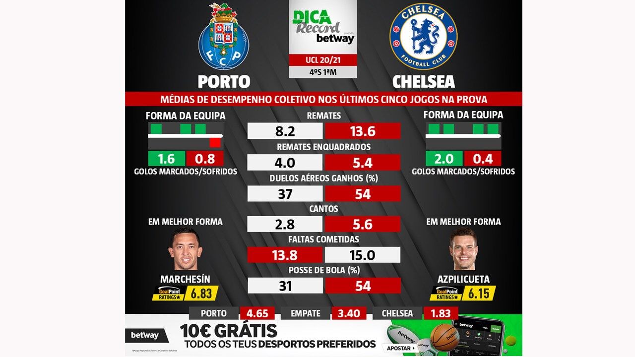 As melhores previsões para o FC Porto-Chelsea: médias de desempenho coletivo das duas equipas