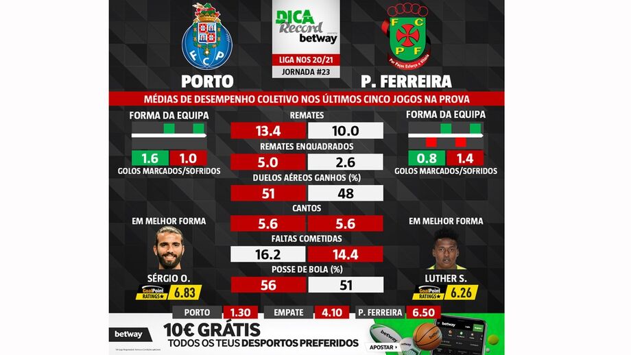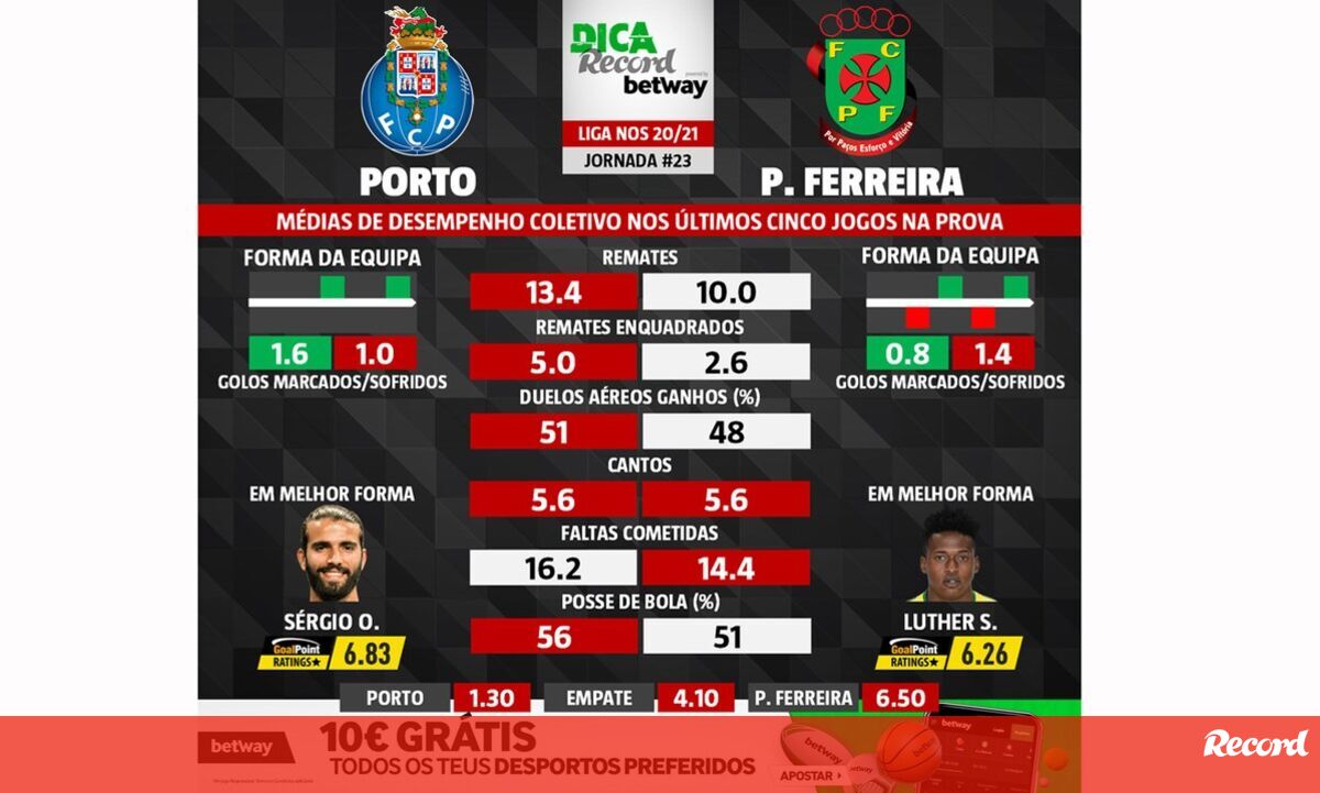 O FC Porto (3.º) recebe o Paços de Ferreira (5.º), no próximo domingo (20h00), num encontro da 23.ª jornada do campeonato. Fique a conhecer as médias de desempenho coletivo de ambas as equipas nos últimos cinco jogos na prova.