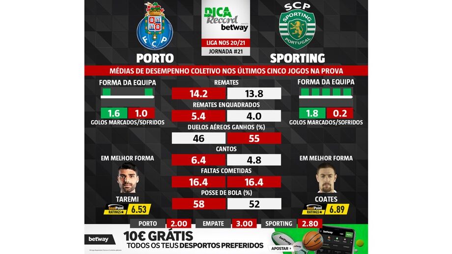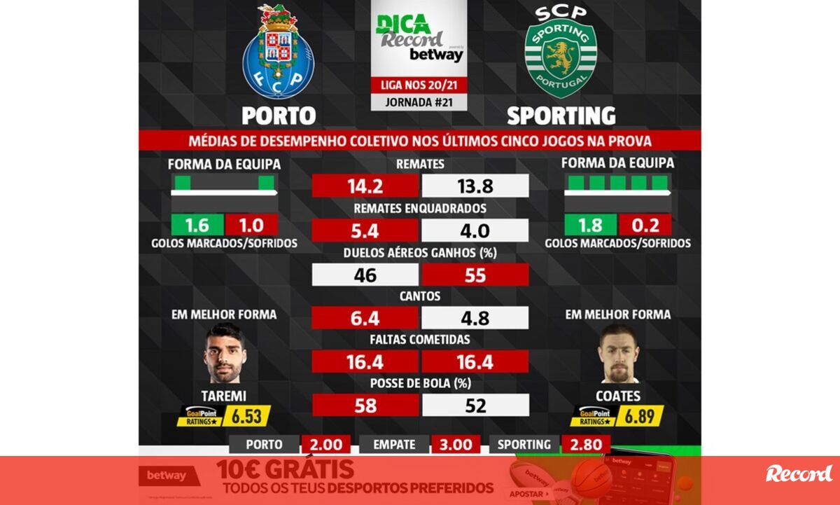 24 fevereiro 2021 - 20:14 As melhores previsões para o FC Porto-Sporting: médias de desempenho coletivo das duas equipas ... × Funcionalidade exclusiva para assinantes Record Premium Assine para partilhar E usufrua de todas as vantagens de ser assinante Deixe o seu comentário Para poder guardar esta notícia deverá efectuar login. Caso não esteja registado no site do Record, efectue o seu registo gratuito. 24.02.2021 As melhores previsões para o FC Porto-Sporting: médias de desempenho coletivo das duas equipas Deixe o seu comentário