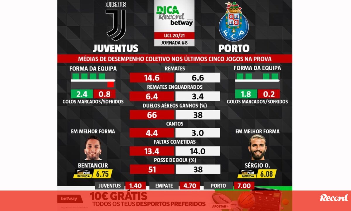 As melhores previsões para o Juventus-FC Porto: médias de desempenho coletivo das duas equipas