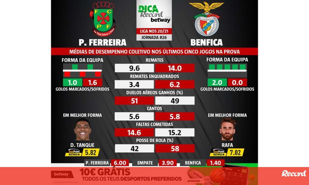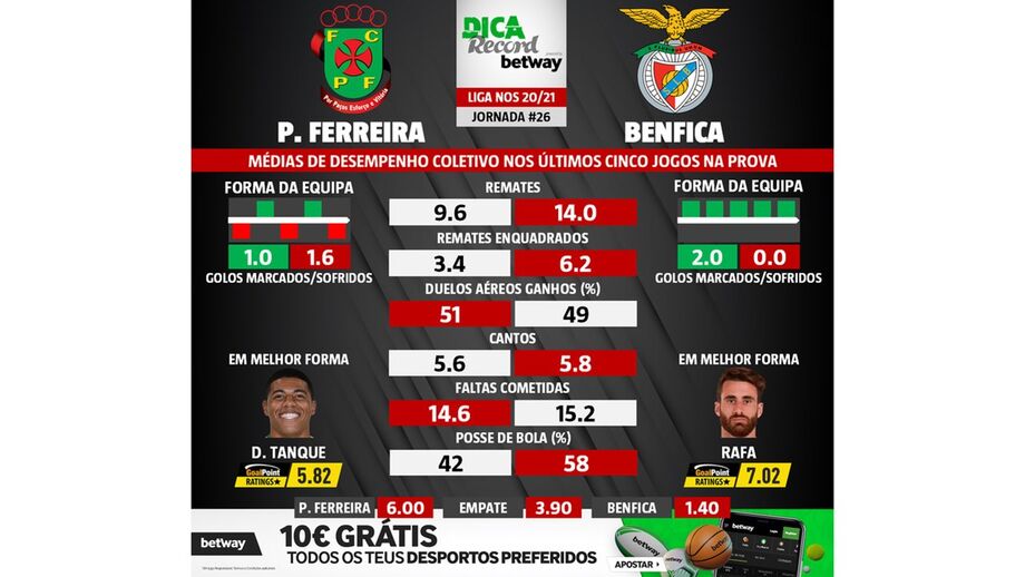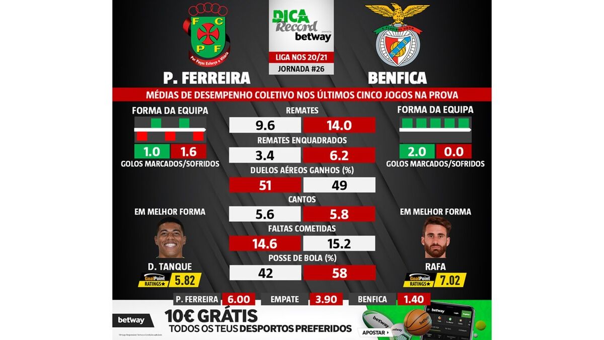 As melhores previsões para o P. Ferreira-Benfica: médias de desempenho coletivo das duas equipas