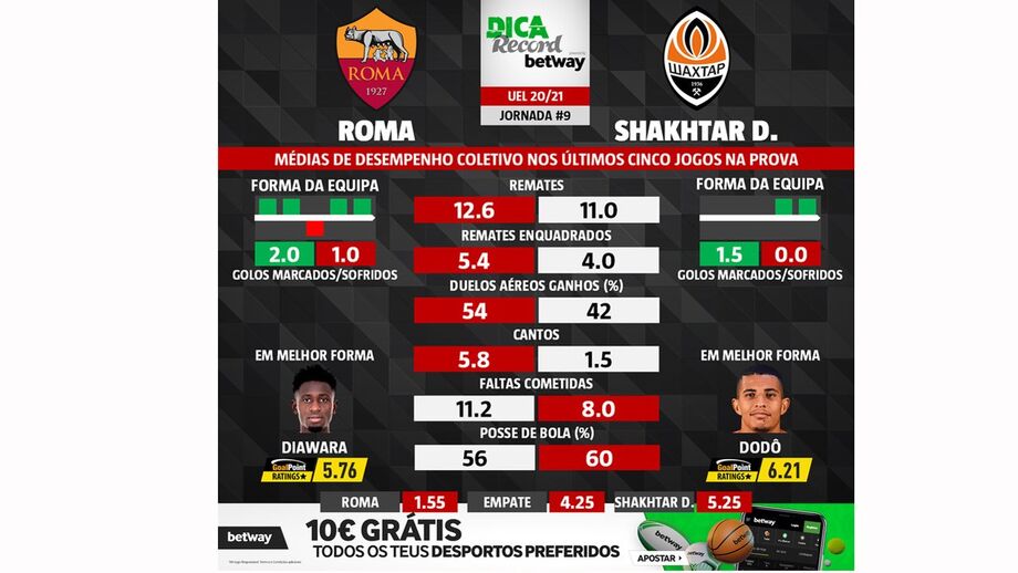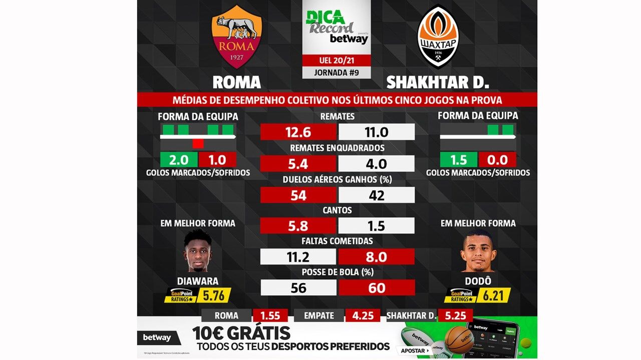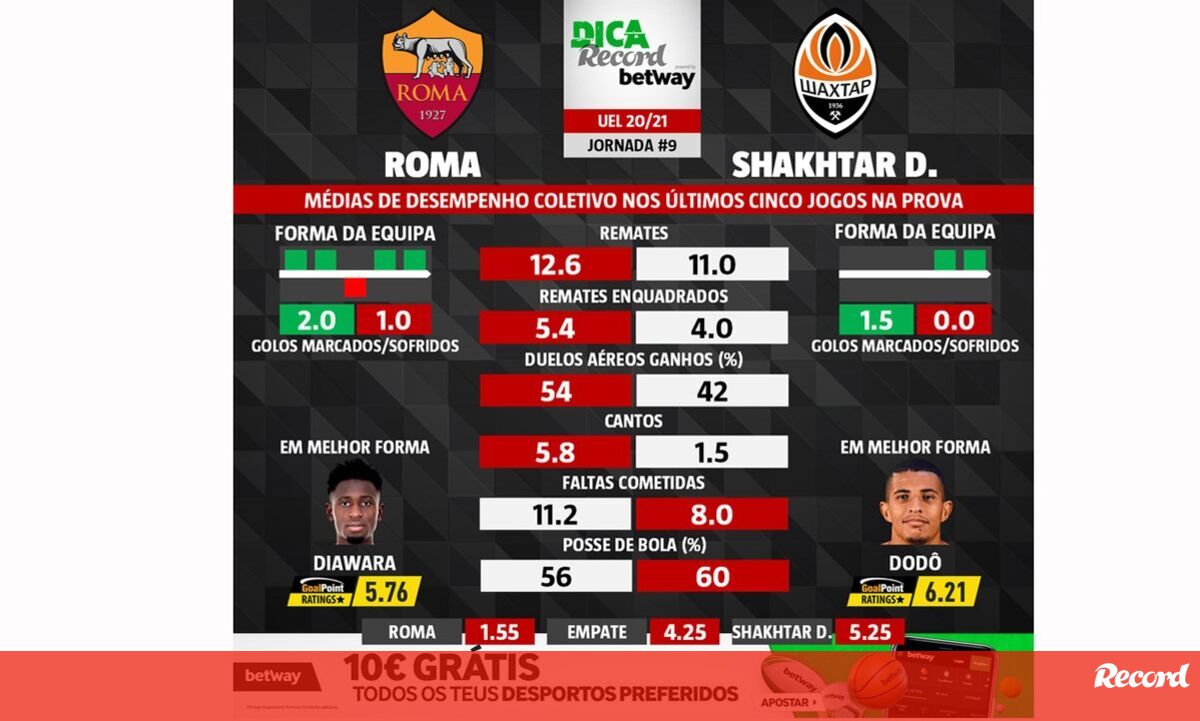 10 março 2021 - 12:00 As melhores previsões para o Roma-Shakhtar: médias de desempenho coletivo das duas equipas ... × Funcionalidade exclusiva para assinantes Record Premium Assine para partilhar E usufrua de todas as vantagens de ser assinante Deixe o seu comentário Para poder guardar esta notícia deverá efectuar login. Caso não esteja registado no site do Record, efectue o seu registo gratuito. 10.03.2021 As melhores previsões para o Roma-Shakhtar: médias de desempenho coletivo das duas equipas Deixe o seu comentário