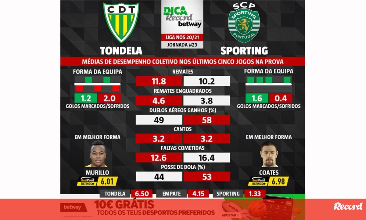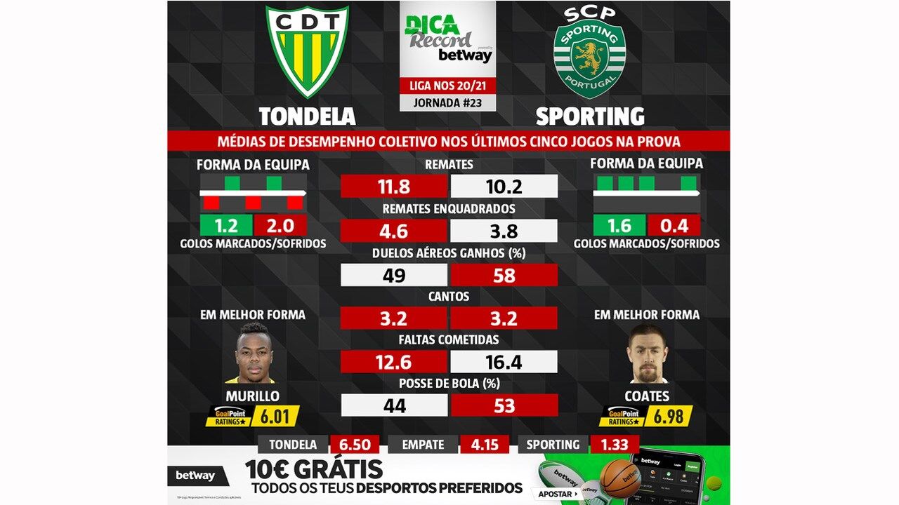 O Sporting (1.º) vai até ao terreno do Tondela (10.º), no próximo sábado (20h30), num encontro da 23.ª jornada do campeonato. Fique a conhecer as médias de desempenho coletivo de ambas as equipas nos últimos cinco jogos na prova.