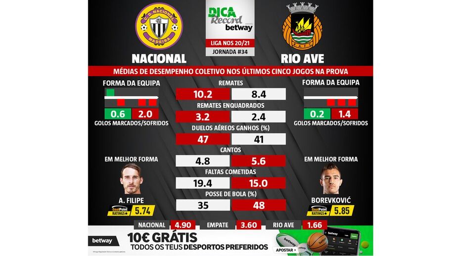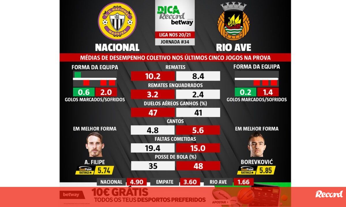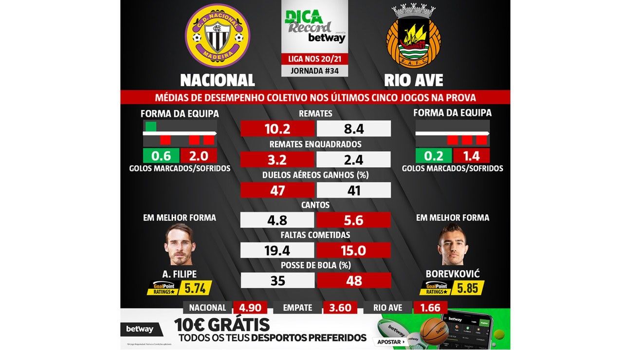 O Nacional recebe o Rio Ave amanhã, às 20h00, num encontro da 34.ª e última jornada da Liga NOS. Estes dados estatísticos são essenciais se está a pensar apostar nesta partida.