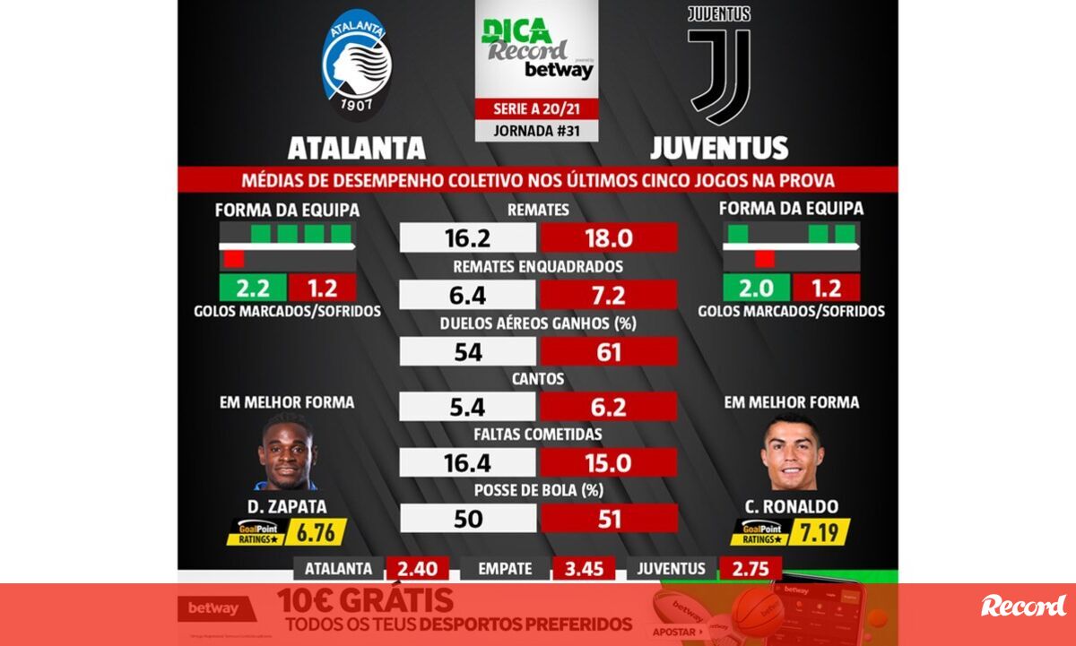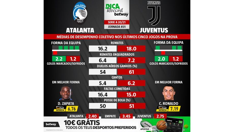 Com Cristiano Ronaldo na frente de ataque dos visitantes, o encontro entre Atalanta e Juventus promete desde logo muitas tentativas de golo, bem ao jeito do avançado português. Mas a verdade é que do outro lado estará também uma equipa que não tem problemas em visar a baliza, como mostram as estatísticas.