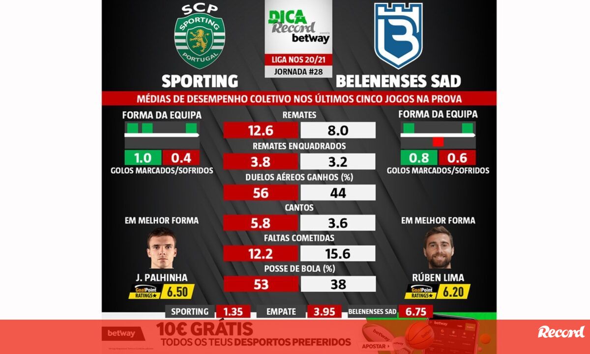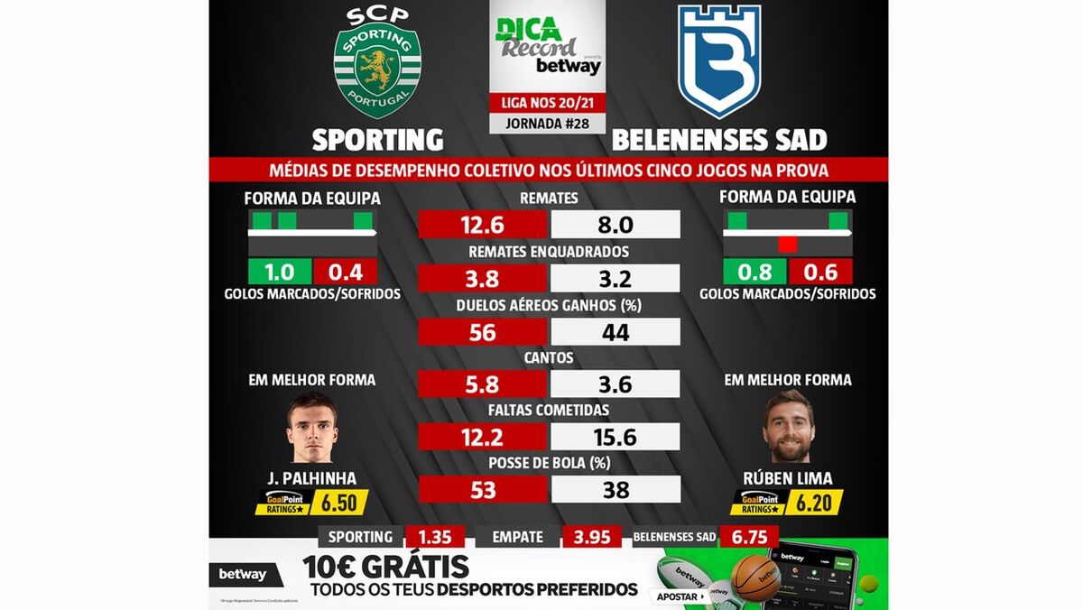 O Sporting recebe o Belenenses SAD na quarta-feira (21h15), em partida da 28.ª jornada da Liga NOS. Se vai apostar, tenha atenção ao número de remates dos leões, muito superior em média ao dos azuis. Mas também a outros parâmetros, nos quais o líder do campeonato se destaca.