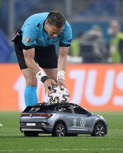 Antes do início do Turquia-Itália, jogo inaugural do Euro'2020, o árbitro Danny Makkelie recebeu a bola que foi utilizada no pontapé de saída de forma curiosa, com um carro telecomandado da marca Volkswagen a percorrer parte do relvado do Estádio Olímpico de Roma antes de 'estacionar' perto do juiz holandês. [Imagens: Lusa/EPA]