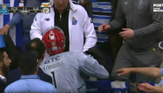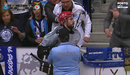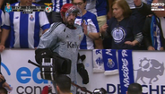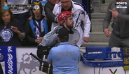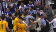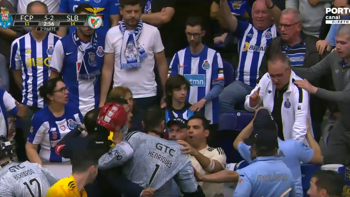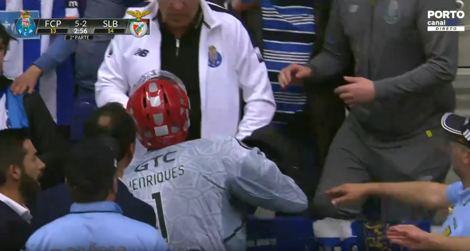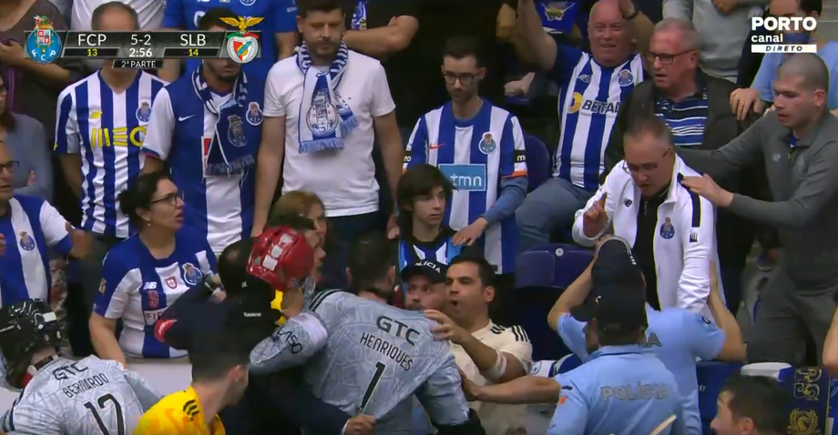 Pedro Henriques viu o cartão azul após tirar de esforço a um adversário e viu os instantes finais do jogo no Dragão Arena no banco do Benfica. O guarda-redes das águias foi, depois, empurrado por um adepto do FC Porto, que se encontrava junto ao banco, e gerou-se uma grande confusão, obrigando à intervenção da polícia, que reforçou a presença no local. Tudo acabou sanado com uma conversa acalorada entre os intervenientes. As autoridades dali não saíram até ao final do jogo 4 da meia-final de hóquei em patins que os dragões venceram (5-2). [Imagens: Porto Canal]