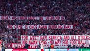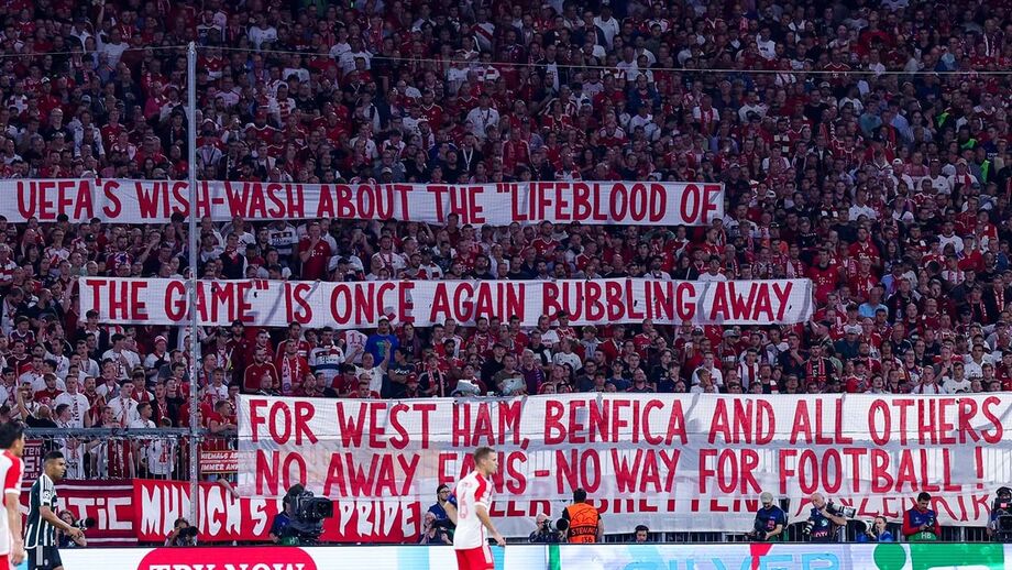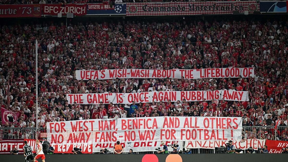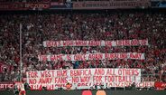 "A tanga da UEFA sobre 'a alma do jogo' está uma vez mais a 'bombar'. Para West Ham, Benfica e todos os outros. Sem adeptos fora de casa - sem caminho para o futebol", pode ler-se na tarja.