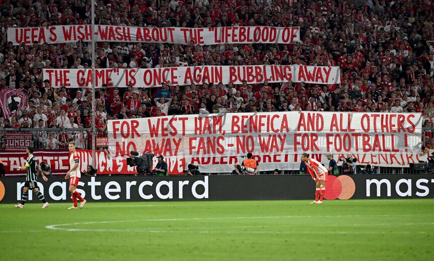 Os adeptos mais radicais do Bayern Munique visaram a UEFA esta quarta-feira, durante o jogo com o Manchester United, com a exibição de uma tarja na qual questionam as políticas disciplinares no organismo. Em causa as punições aplicadas a West Ham e Benfica, que nos primeiros jogos fora de casa nas competições europeias não terão adeptos nas bancadas. Os encarnados, recorde-se, não terão fãs nas bancadas do Giuseppe Meazza na 2.ª jornada da Champions, por conta dos incidentes ocorridos nos 'quartos' da prova da UEFA da época passada - atiraram tochas para cima dos adeptos nerazzurri.