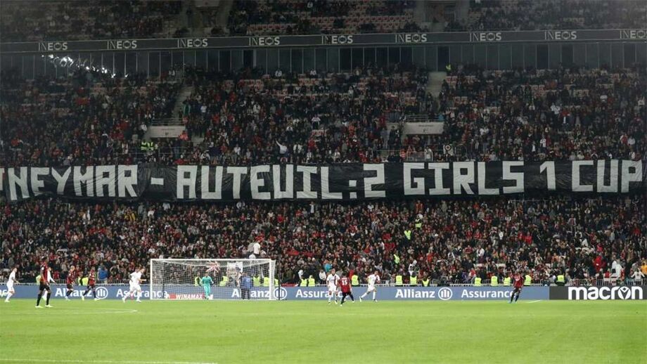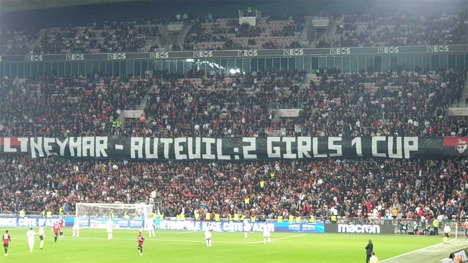 Ausente do jogo desta noite do Paris SG devido a lesão, Neymar não deixou de ser visado pelos adeptos do Nice, que durante o encontro aproveitaram para exibir uma tarja algo 'estranha'. Nela é possível ler-se a inscrição "Neymar-Auteuil: 2 girls, 1 cup", alusiva ao conflito entre os ultras (habitualmente situados na tribuna Auteuil do Parque dos Príncipes) e o avançado brasileiro. A referência a '2 girls, 1 cup' diz respeito a um polémico filme pornográfico brasileiro (se tiver curiosidade em saber da sua temática o melhor é utilizar o Google...)