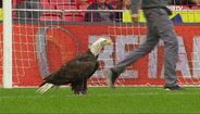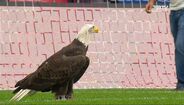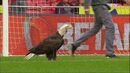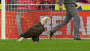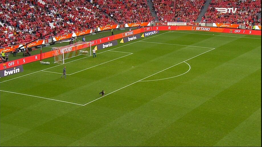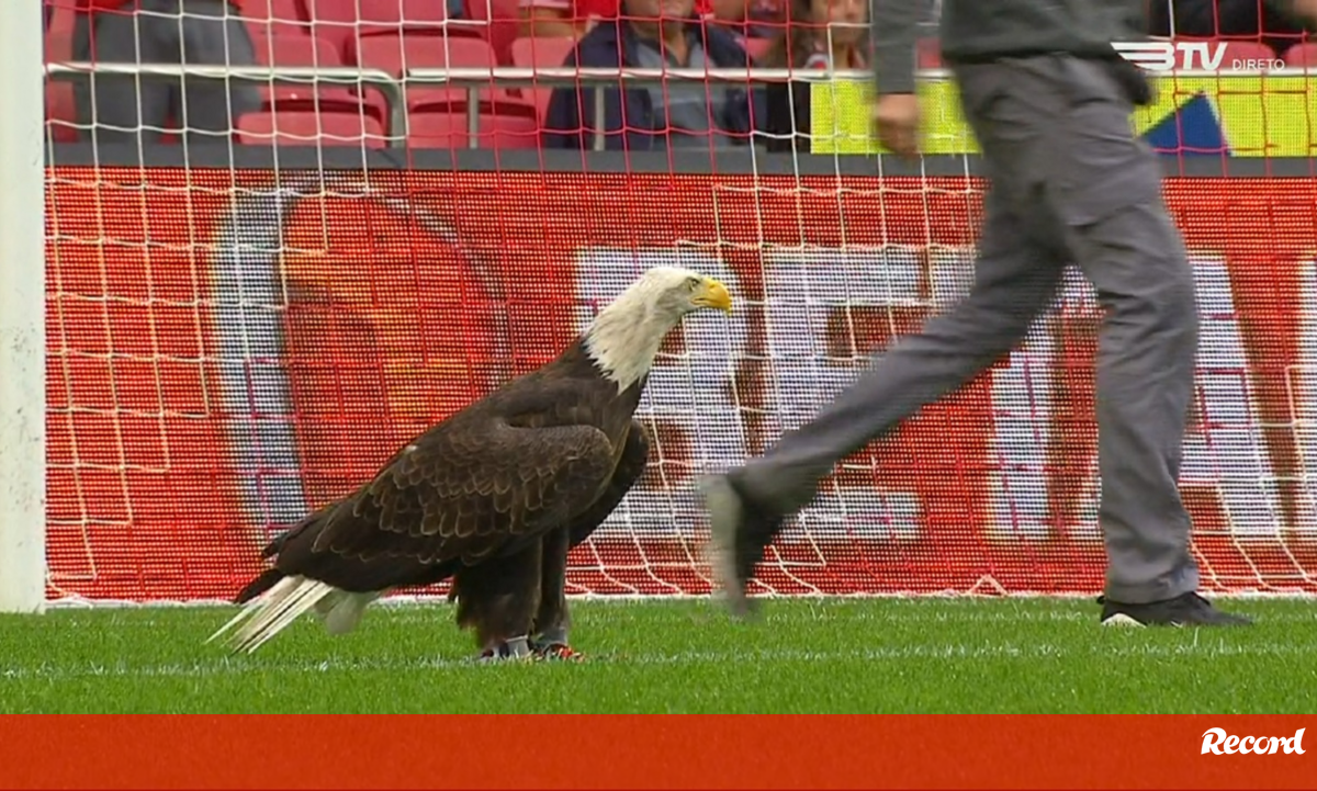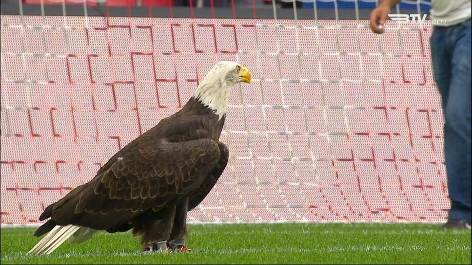 Á aguia Vitória aterrou no relvado da Luz antes do Benfica-Chaves, ao contrário do símbolo dos encarnados, onde é previsto ficar depois de cada voo antes do apito inicial. A situação não é inédita mas é incomum. [Imagens: BTV]
