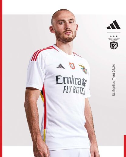 O Benfica divulgou esta sexta-feira as imagens do terceiro equipamento para a próxima época. "Após o lançamento da camisola alternativa de cor preta, com 5 listas de 5 cores diferentes, a 3.ª camisola assume-se como um clássico: cor branca, com 3 listas vermelhas que sobressaem na linha dos ombros e detalhes de 5 cores distintas colocados na lateral, bem como a debruar a bainha da camisola, atribuindo especial destaque à pluralidade de cores. O objetivo é um só: enaltecer uma comunidade que se mantém unida pelo clube", explicam os encarnados no seu site oficial