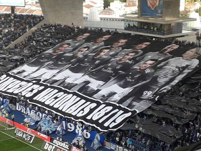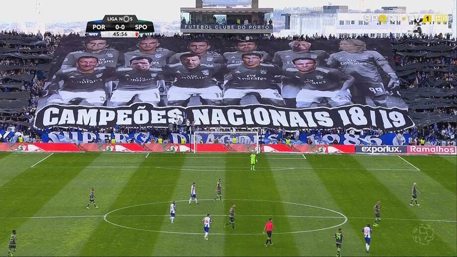 Pouco depois do reatamento do duelo diante do Sporting, e já sabendo que na Luz o Benfica vencia por 3-0, os Super Dragões mostraram uma enorme tarja onde indicam que os campeões nacionais foram figuras como António Costa, César Boaventura e também vários árbitros.