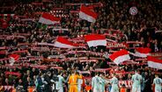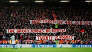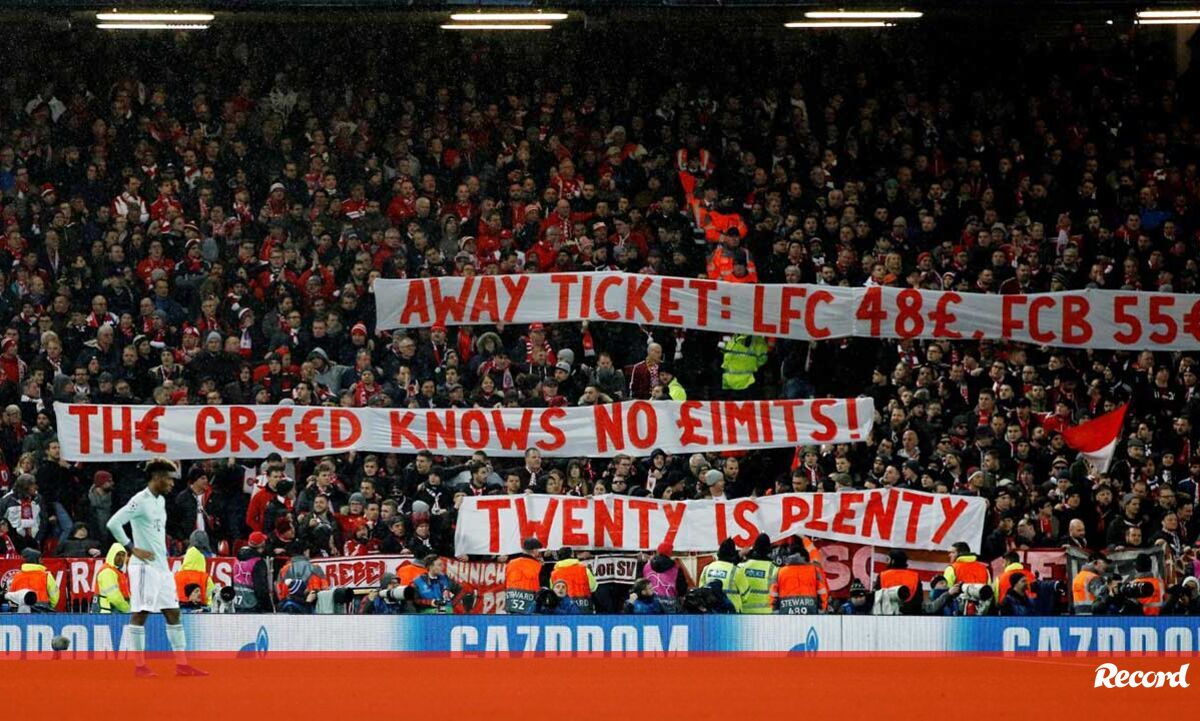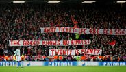 Durante o Liverpool-Bayern (0-0), os adeptos bávaros exibiram tarjas onde se queixavam dos preços dos bilhetes (55 euros) para a partida desta noite. E os seguidores ingleses concordaram e aplaudiram. [Fotos: Reuters e EPA]