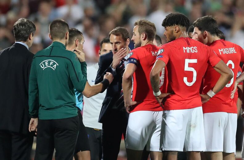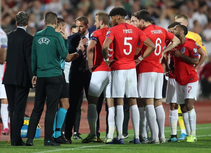 O Bulgária-Inglaterra foi interrompido durante alguns minutos na primeira parte por causa de terem sido entoados cânticos racista. Esta imagem mostra o momento em que treinadores, jogadores e árbitros conferenciam para ver o que fazer.