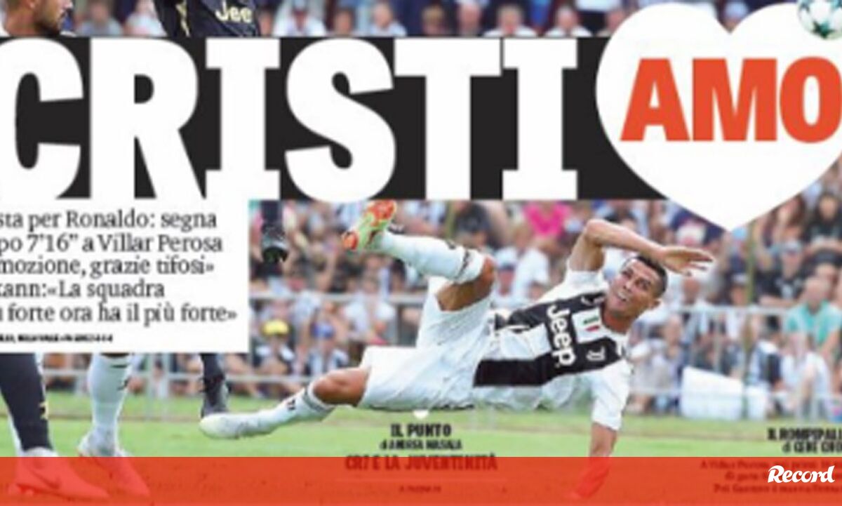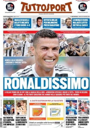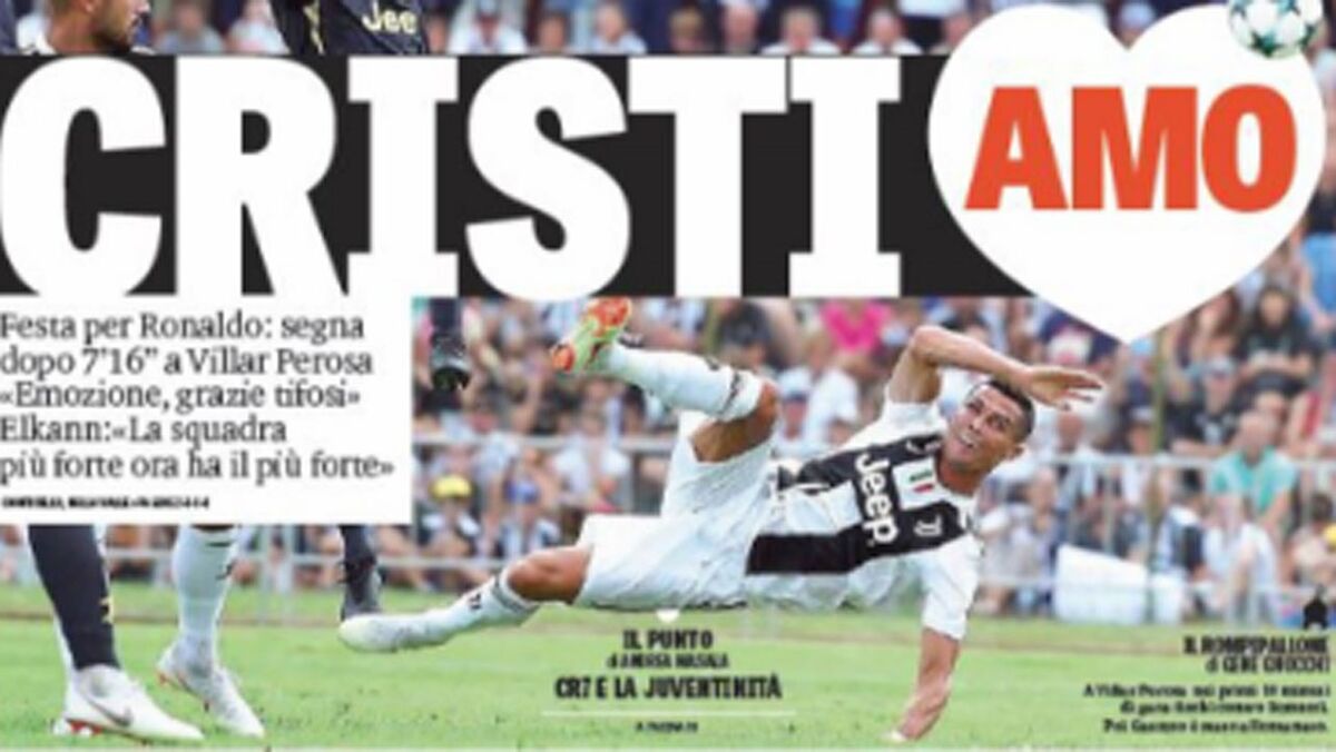 Cristiano Ronaldo estreou-se domingo pela Juventus e só necessitou de 7’15’’ para marcar no jogo-treino com a equipa B da Vecchia Signora (a Juve A goleou por 5-0), ocasionando uma enorme explosão de alegria aos 5.000 adeptos que lotaram o Gaetano Scirea em Villar Perosa. Esta segunda-feiras a primeira página dos jornais italianos reflete esse entusiasmo.