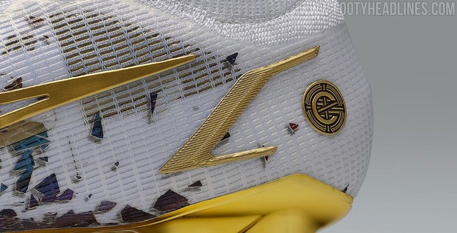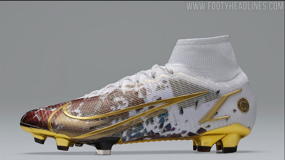 Cristiano Ronaldo bateu na semana passada o recorde de maior goleador da história das seleções e esta terça-feira, no seu primeiro treino pelo Manchester United, já subiu ao relvado com umas chuteiras alusivas a esse registo. Criadas pela Nike, a marca que o patrocina há largos anos, as Mercurial Superfly VIII 'CR110' contam com vários pormenores especiais, nomeadamente a presença da data (6 de junho de 2004) e ainda o minuto (90'+3) referentes ao primeiro golo que marcou por Portugal. (fotos: Nike e Getty Images)