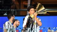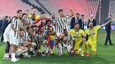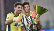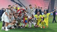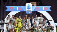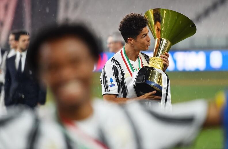 Apesar de ter conquistado o 9.º 'scudetto' consecutivo na semana passada, só ontem a Juventus recebeu a taça de campeã italiana após o duelo com a Roma (1-3), em Turim, na jornada que fechou a edição 2019/20 da Serie A. Cristiano Ronaldo não integrou a convocatória, assistiu ao jogo na bancada mas juntou-se aos colegas na hora dos festejos e o avançado português de 35 anos ergueu assim o 3.º troféu (2 campeonatos e uma Supertaça de Itália) ao serviço da vecchia signora. [Imagens: Reuters]