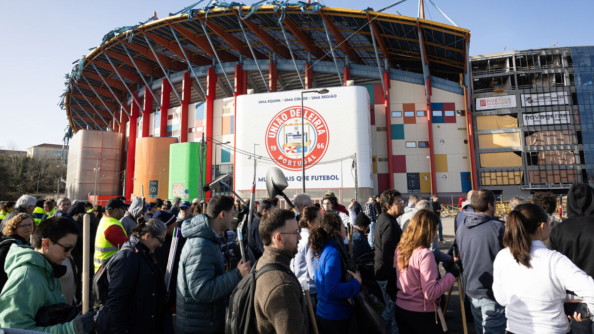 Dezenas de voluntários meteram este sábado mãos à obra e ajudaram a limpar os estragos resultantes da depressão Kristin no exterior do Estádio da U. Leiria, o Dr. Magalhães Pessoa. Nas redes sociais, o clube partilhou algumas imagens do momento, com muitas pessoas juntas num momento de solidariedade. (Imagens: U. Leiria)