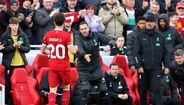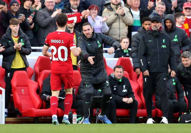 Diogo Jota inaugurou este domingo o marcador no Liverpool-Nottingham Forest e, nos festejos do golo, foi ao banco de suplentes buscar uma camisola de Luis Díaz e mostrou-a às bancadas. Refira-se que os pais do extremo, ex-FC Porto, foram raptados nas últimas horas na Colômbia, motivo que levou Klopp a deixá-lo fora da partida desta tarde. (Imagens: Reuters)