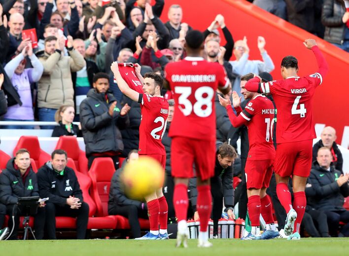 Diogo Jota inaugura marcador no Liverpool-Nottingham Forest e mostra camisola de Luis Díaz