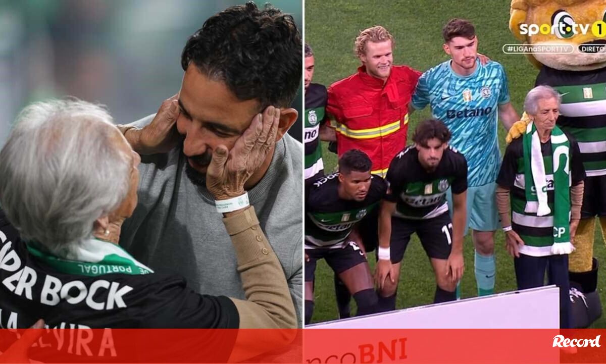 Dona Maria no relvado de Alvalade: abraçou Rúben Amorim e tirou foto com toda a equipa do Sporting