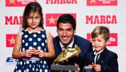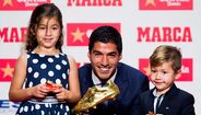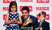 O avançado uruguaio do Barcelona Luis Suárez recebeu esta quinta-feira a Bota de Ouro, por ter sido o melhor marcador na época passada. O prémio foi entregue pelos filhos, Delfina e Benjamin. [Fotos: Getty Images]