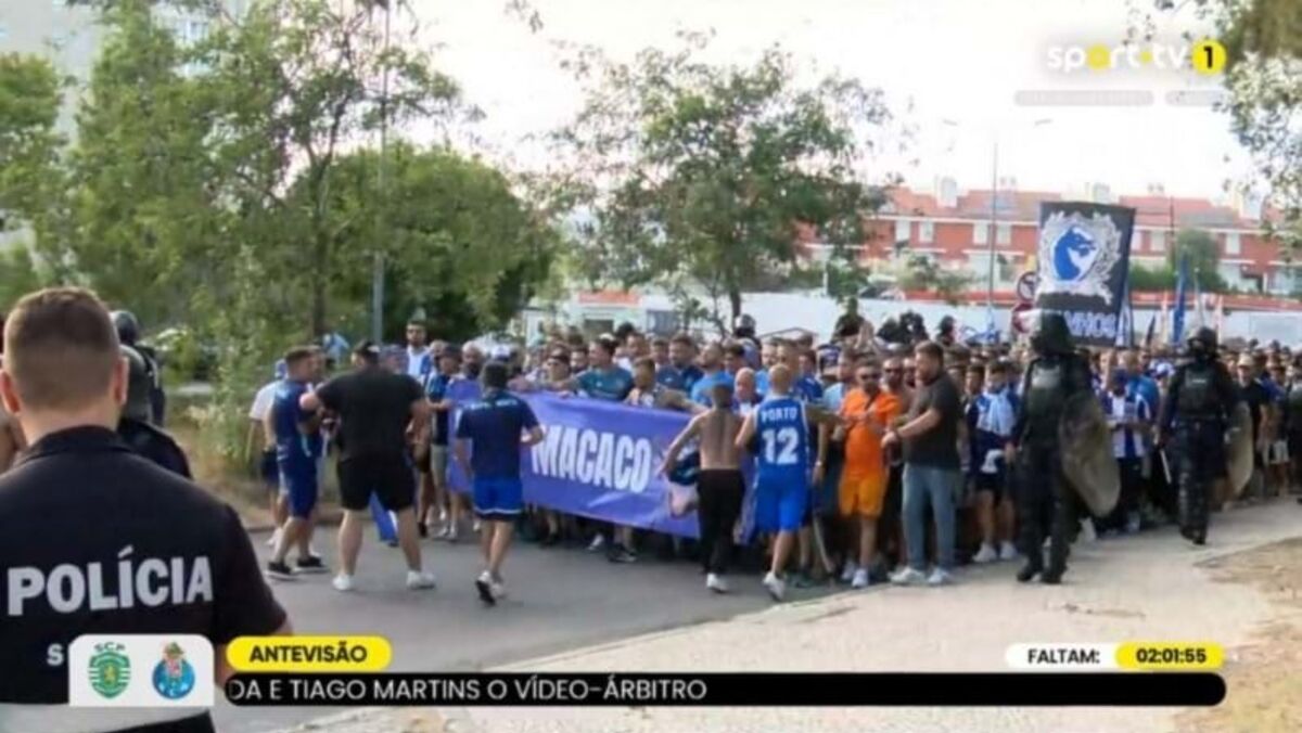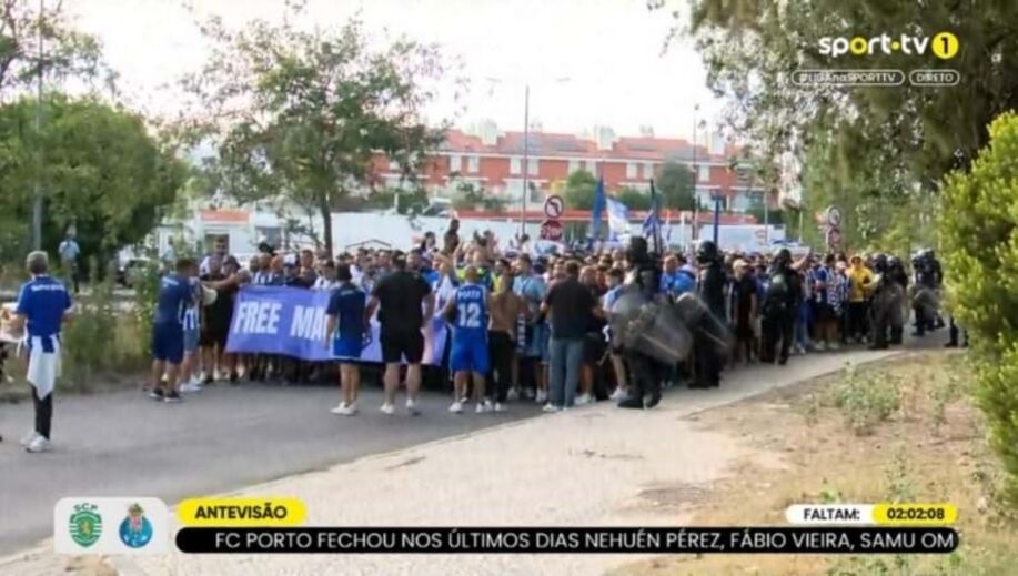 Os Super Dragões exibiram este sábado, horas antes do início do clássico com o Sporting na 4.ª jornada da Liga Portugal Betclic, uma tarja a pedir liberdade para Fernando Madureira, o antigo líder da claque portista. "Free Macaco", pode ler-se na mensagem exibida pelo GOA. [Frames: Sport TV]