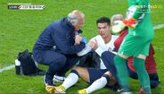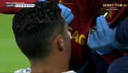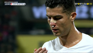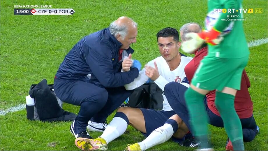 O guarda-redes checo caiu em cima de Ronaldo e o capitão da Seleção ficou a sangrar abundantemente. Vaclik saiu da baliza e acabou por colocar CR7 a escorrer sangue da face, necessitando de assistência prolongada a partir do minuto 13. Antes, ao minuto 9 Brabec havia pisado Ronaldo na área, deixando a meia do avançado luso furada, com queixas do número 7 nacional ao juiz da partida. [Imagens: Sport TV]