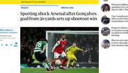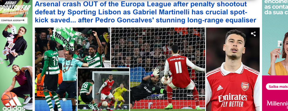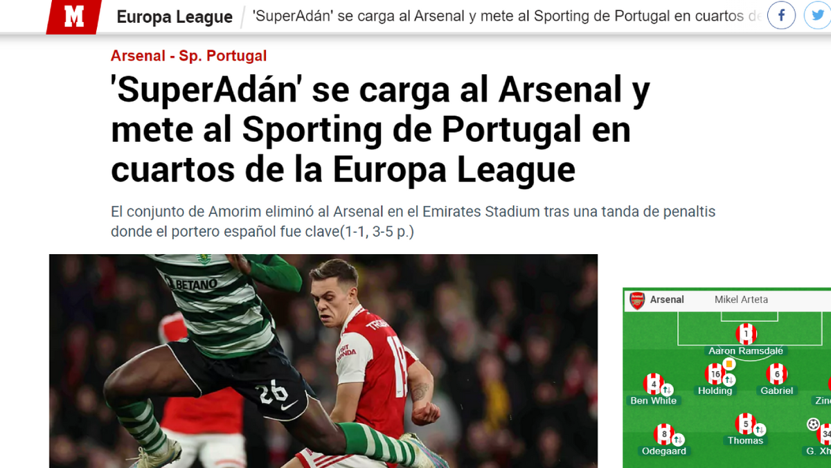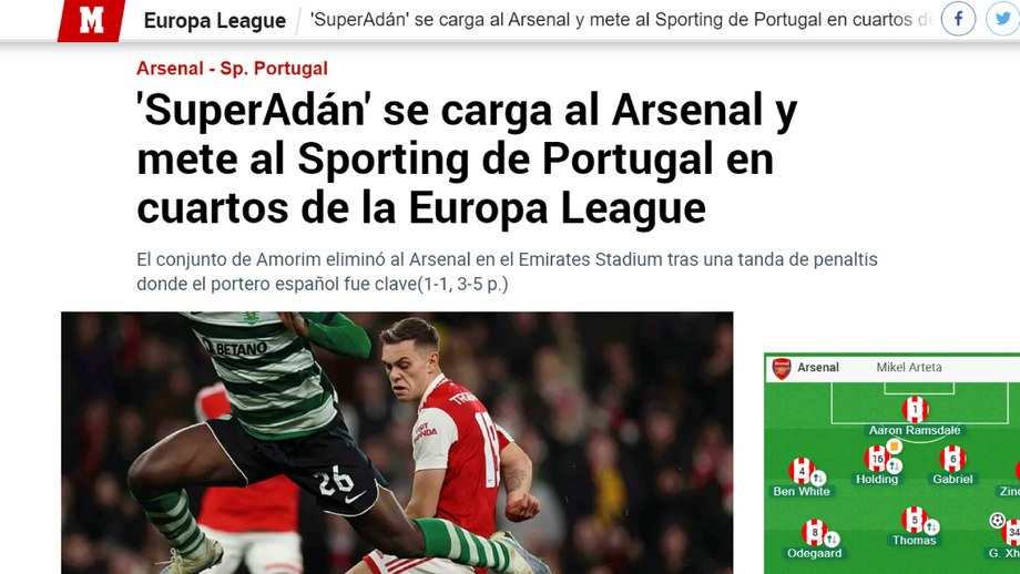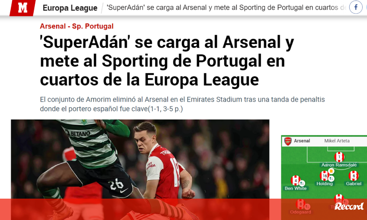 O Sporting foi brilhante na casa do Arsenal e eliminou os gunners da Liga Europa nos penáltis. A imprensa internacional mostrou olhar atento em relação à eliminatória europeia que sorriu aos portugueses, em pleno Emirates. Do 'SuperÁdan' ao golo de antologia de Pote, quase de meio-campo, houve vários destaque no triunfodos homens de Rúben Amorim.