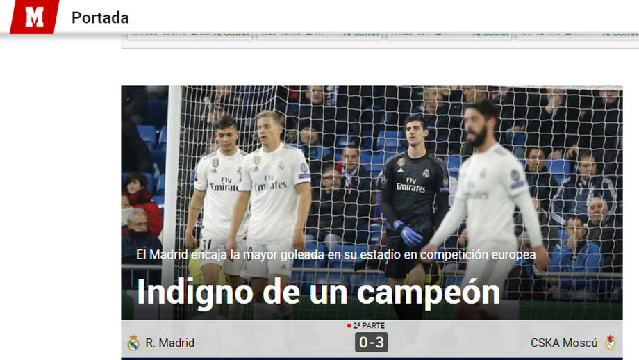O Real Madrid perdeu com o CSKA Moscovo por 3-0 no Bernabéu e a imprensa não poupou nas críticas à equipa de Solari.