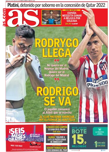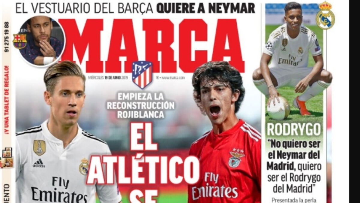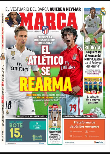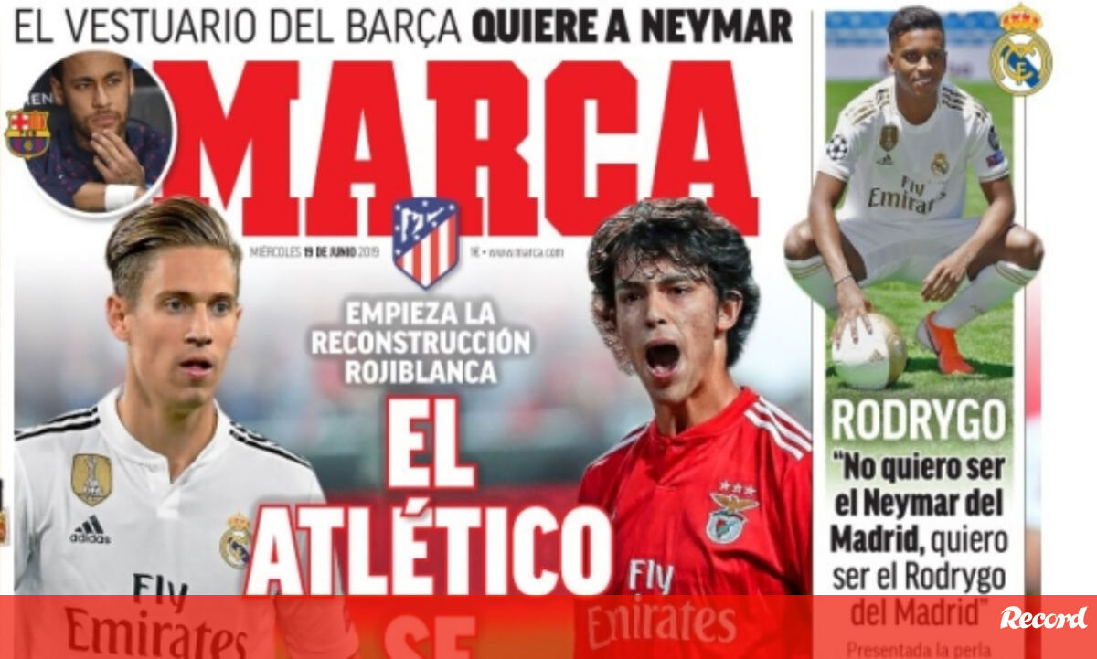 O negócio ainda não foi oficializado mas continua a fazer correr muita tinta. A 'Marca' dá esta quarta-feira grande destaque a João Félix na sua primeira página; o 'As' diz que o Atlético Madrid vai anunciar hoje a contratação do jogador do Benfica.