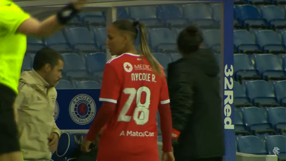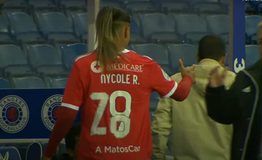 Nycole Raysla usa o número 9 em competições internas mas está inscrita com o 28 na Liga dos Campeões. A avançada brasileira entrou na segunda parte da partida diante do Rangers, na Escócia, e a forma que as águias arranjaram para solucionar o problema foi pintar o número à mão. Assim, jogou com uma camisola alterada, no lugar de Daniela Silva. [Imagens: Rangers TV]
