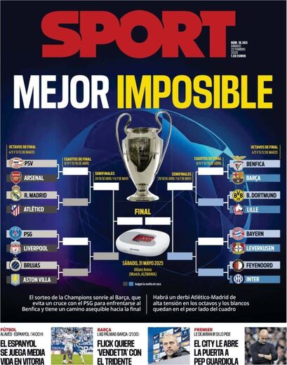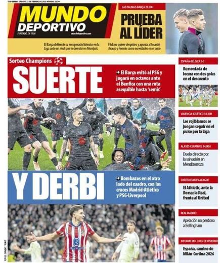 As capas deste sábado dos jornais espanhóis dão destaque ao sorteio dos oitavos de final da Liga dos Campeões, que se realizou ontem na Suíça e que ditou que o Benfica vai defrontar o Barcelona. A imprensa espanhola considera que os blaugrana tiveram "sorte" porque poderia ter calhado o PSG.