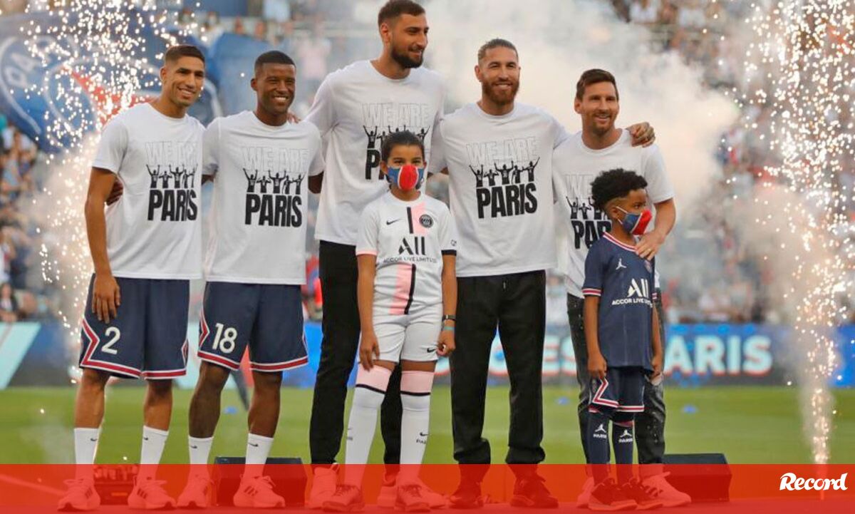 Lionel Messi, Sergio Ramos, Gianluigi Donnarumma, Achraf Hakimi e Georginio Wijnaldum, refoforços do Paris Saint-Germain para a nova temporada, foram este sábado apresentados aos adeptos parisienses antes da receção ao Estrasburgo. [Imagens: Reuters]