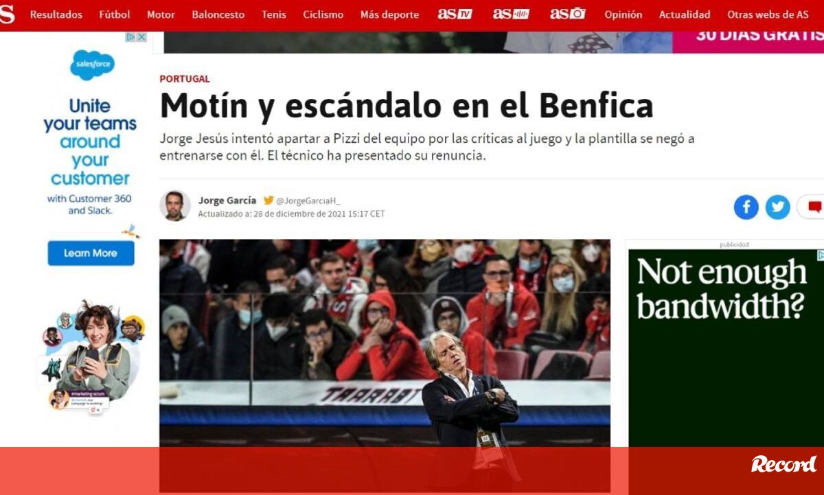 A saída de Jorge Jesus e da sua equipa técnica do Benfica teve repercussão na imprensa desportiva internacional. "Motim e escândalo no Benfica", escreveu, por exemplo, o jornal espanhol 'AS'.