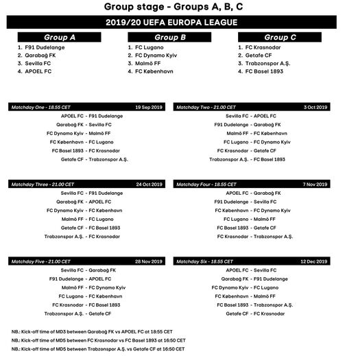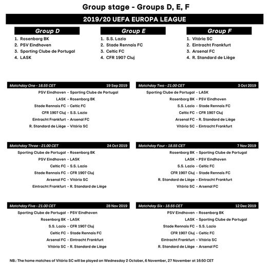 O calendário completo da fase de grupos da Liga Europa