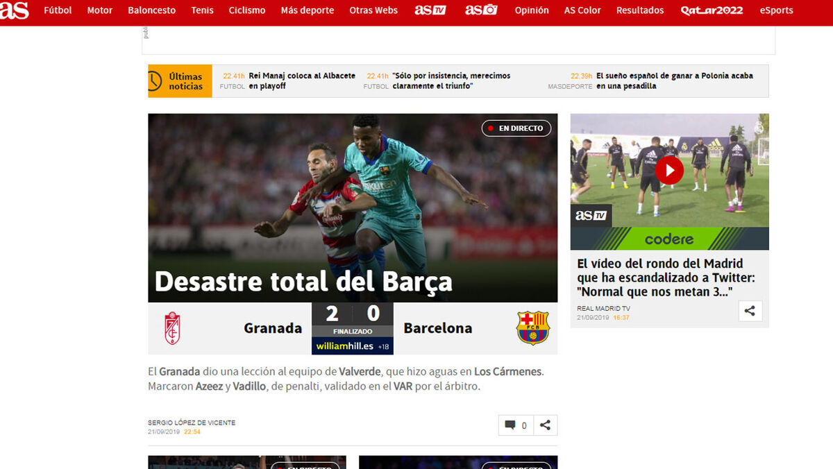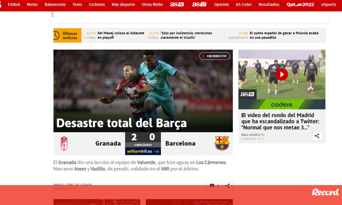 O Barcelona perdeu com o Granada por 2-0 e a imprensa espanhola escreve que "a equipa de Valverde mostra a sua pior versão". "Desastre" é o termo mais utilizado.