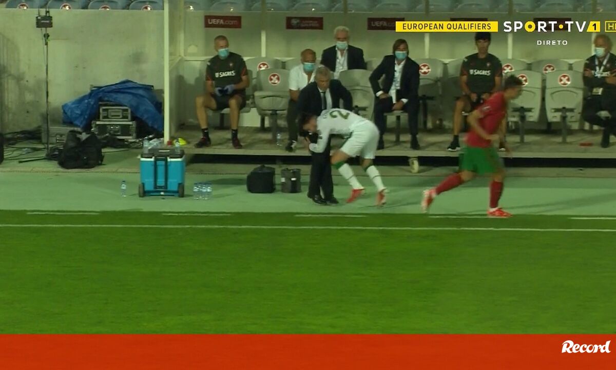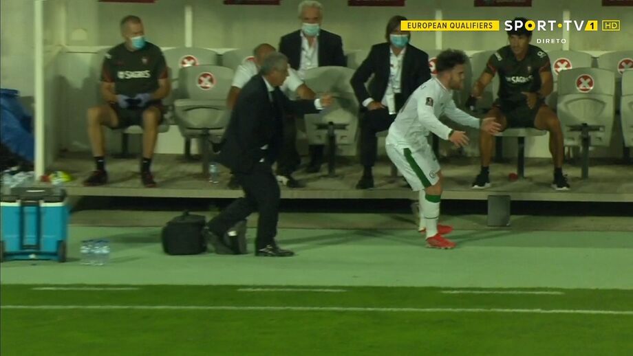Fernando Santos protagonizou um momento insólito diante da Irlanda, quando acabou por ser involuntariamente derrubado por um jogador adversário.