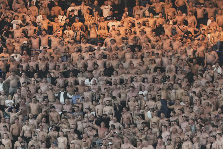 Habituados a temperaturas bem baixas, os adeptos do Légia Varsóvia que se deslocaram a Stamford Bridge parecem ter encarado os pouco mais de 10ºC que se sentem em Londres como verdadeiro... verão. De tal forma que, durante a partida com o Chelsea, surgiram praticamente na sua maioria sem camisola nas bancadas. (Fotos: AP)
