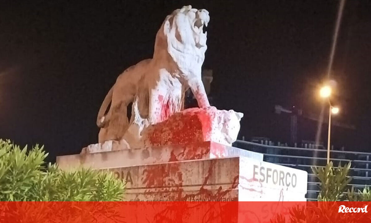 Pintada de vermelho: estátua do leão junto ao Estádio de Alvalade vandalizada