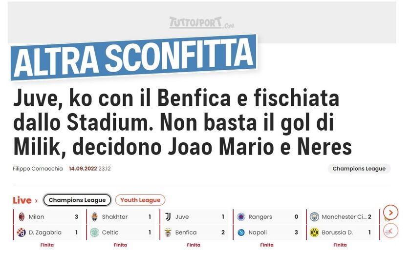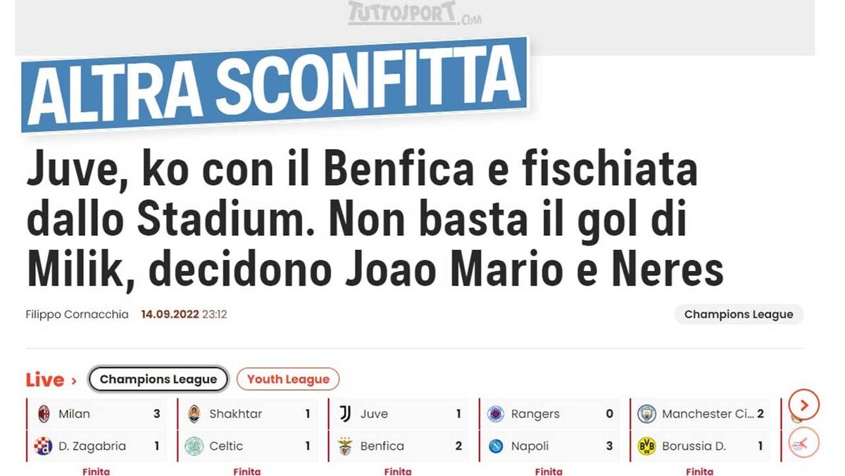 "Pior pesadelo", "outro KO" e "desilusão": as reações da imprensa italiana à derrota da Juventus com o Benfica