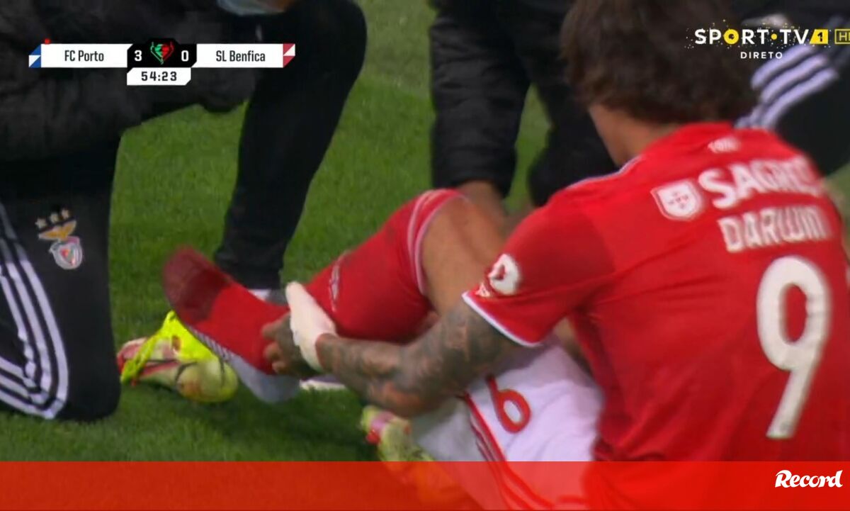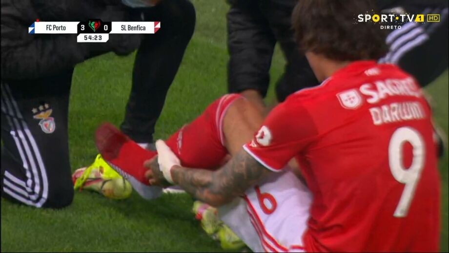 Darwin Núñez teve de ser substituído à hora de jogo diante do FC Porto por lesão. O avançado uruguaio foi pisado num lance por Fábio Cardoso e não conseguiu suportar as dores. A imagem acima mostra bem como ficou o pé do dianteiro das águias.