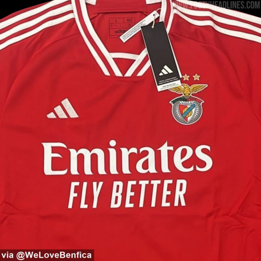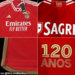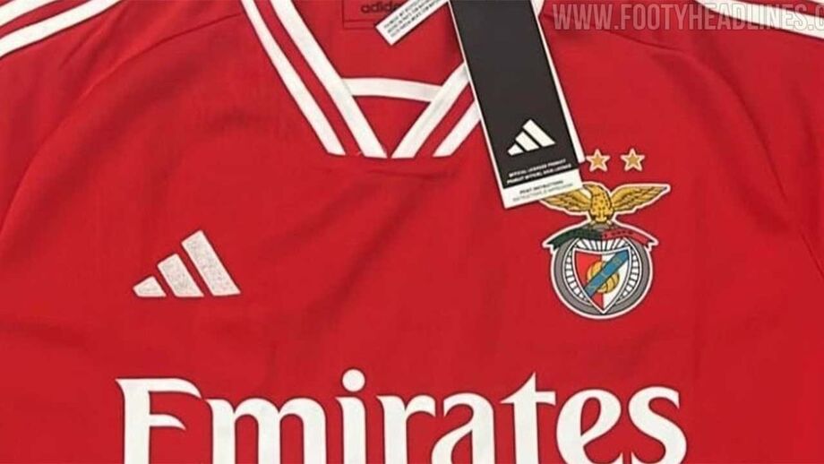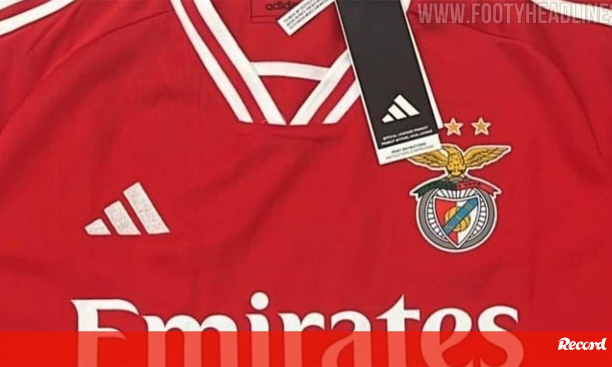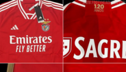 Os portais especializados 'Footy Headlines' e 'Mantos do Futebol' partilharam esta quinta-feira imagens daquela que poderá ser a nova camisola principal do Benfica para 2023/24. Nas imagens publicadas, que foram originalmente recolhidas pela página de Twitter @WeLoveBenfica, é possível ver-se a inscrição '120 anos', alusiva ao facto do clube da Luz celebrar o seu 120.º aniversário a 28 de fevereiro do próximo ano. Recorde-se que na semana passada foram lançadas imagens nas redes sociais daquela que seria a camisola alternativa.