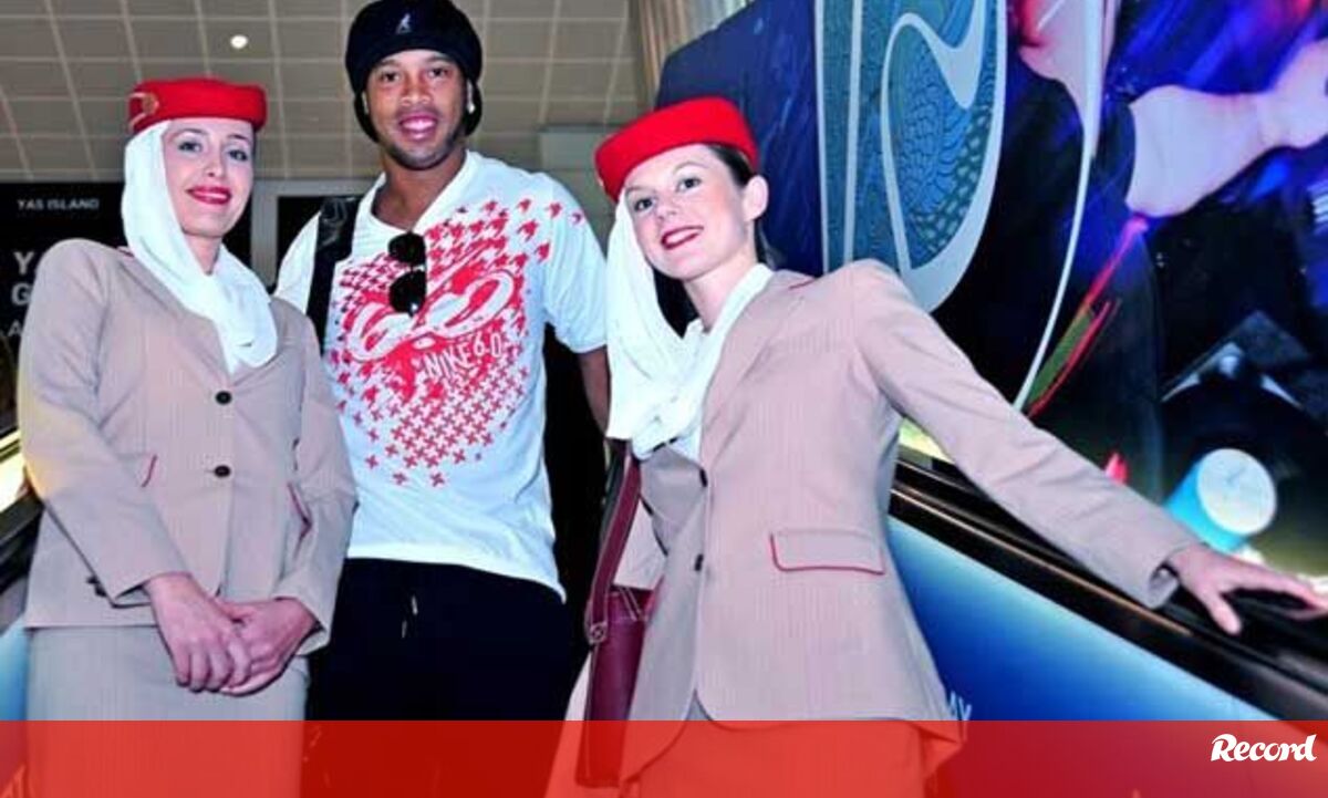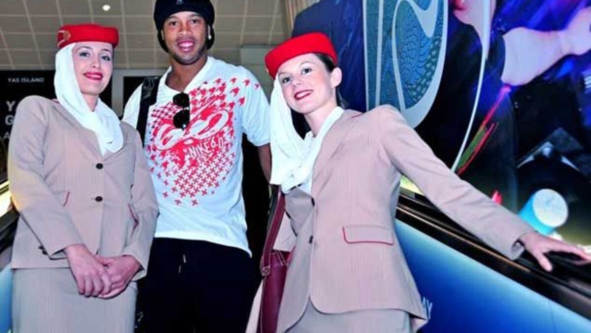 Dubai, 28 dezembro - O AC Milan irá participar num torneio nos Emiratos Árabes Unidos e Ronaldinho aproveitou para posar junto de duas hospedeiras da companhia aérea Emirates.