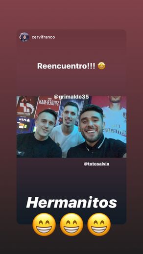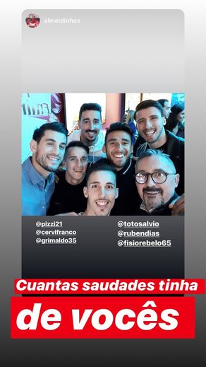 Eduardo Salvio, que em julho passado se transferiu do Benfica para o Boca Juniors, reencontrou ex-companheiros em Lisboa. Numa fotografia partilhada por André Almeida no Instagram, é possível ver o extremo argentino com o lateral-direito, Pizzi, Cervi, Grimaldo e Rúben Dias. Aproveitando paragem do campeonato argentino, Salvio, de 29 anos, deslocou-se à Europa. Esteve com a família na Disneyland, em Paris, e aproveitou para uma visita rápida ao nosso país, onde viveu nos últimos sete anos [Fotos Instagram]