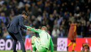 O técnico do FC Porto aproximou-se do guardião da Roma, acarinhou-o e ergueu-o do chão, dando-lhe, de seguida, um sentido abraço